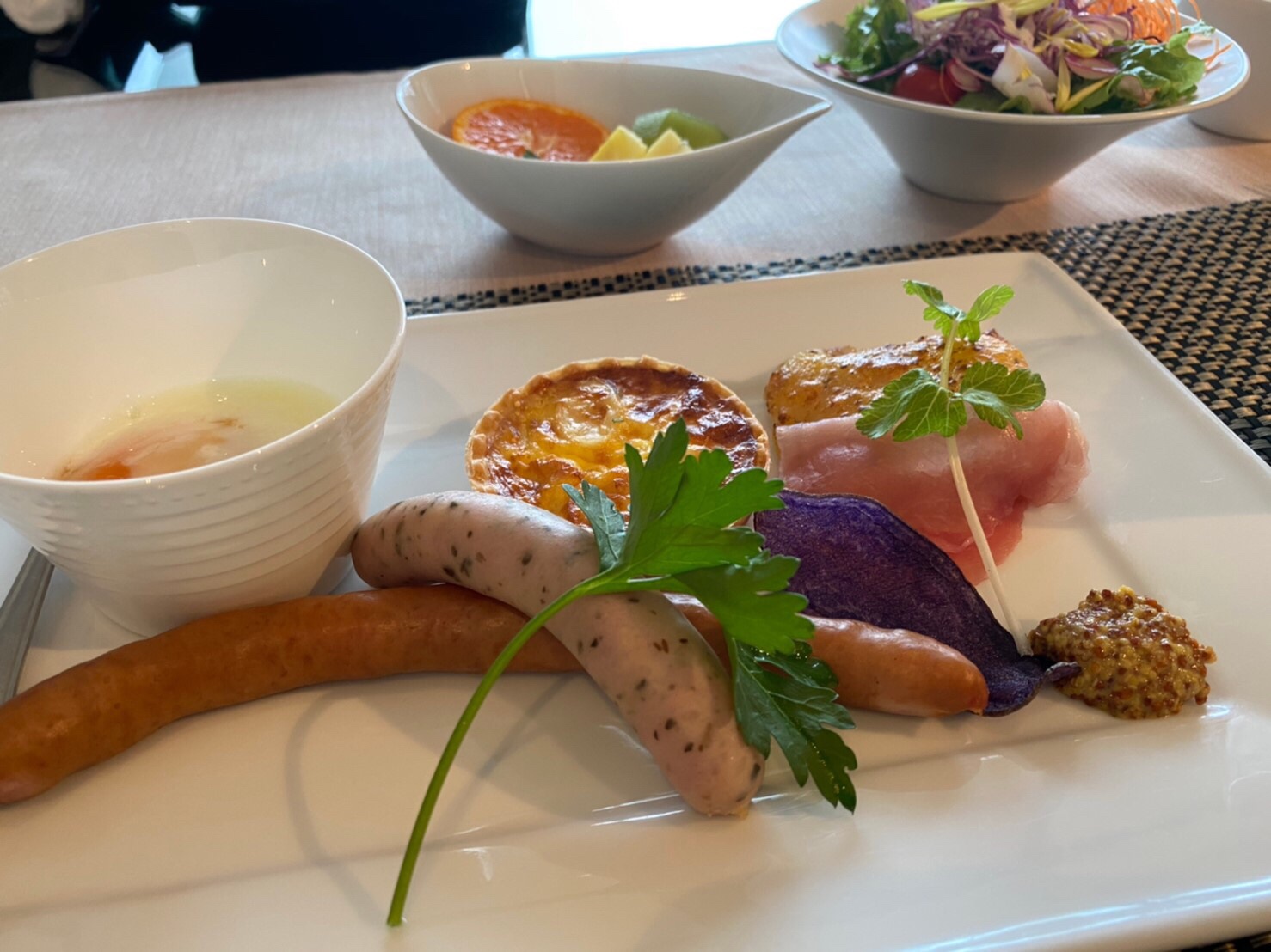 朝食はサラダ、スープ、ソーセージ、キッシュ、パンでした。パンとドリンクはビュッフェスタイルです。