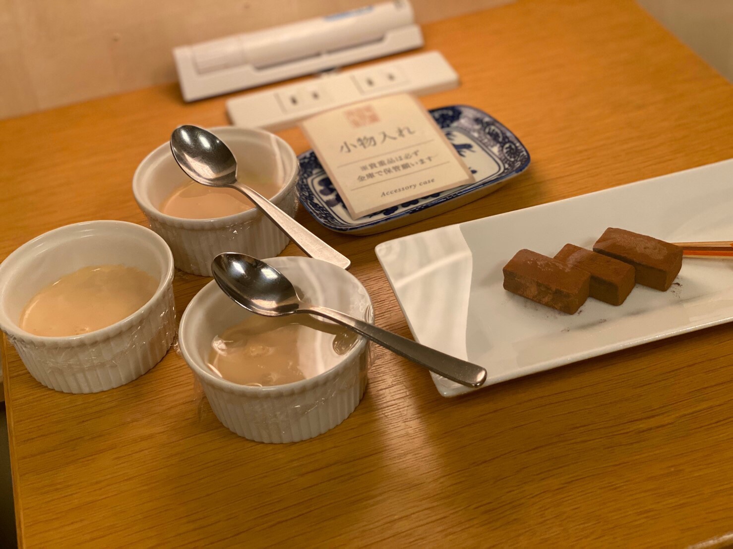 私は家族3名で上の写真の和洋室に泊まりました。一人2万円程度でした。部屋はとても広く、洗面所とトイレも分かれています。ウェルカムスイーツとしてチョコレートとプリンが置いてありました♡